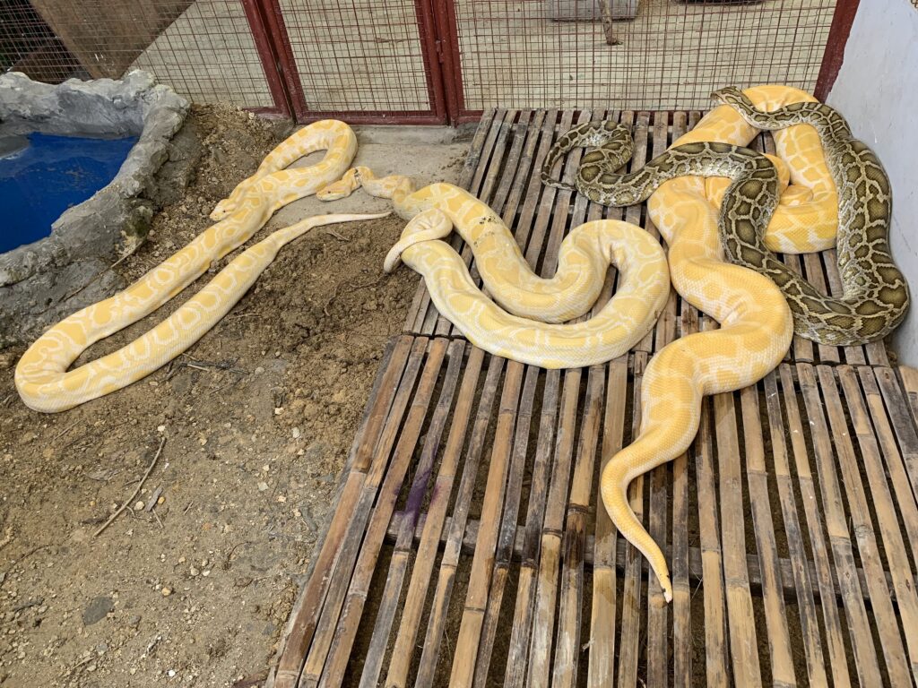 園内には生きたニシキヘビが数匹おり、実際に触れたり写真撮影を体験できます。