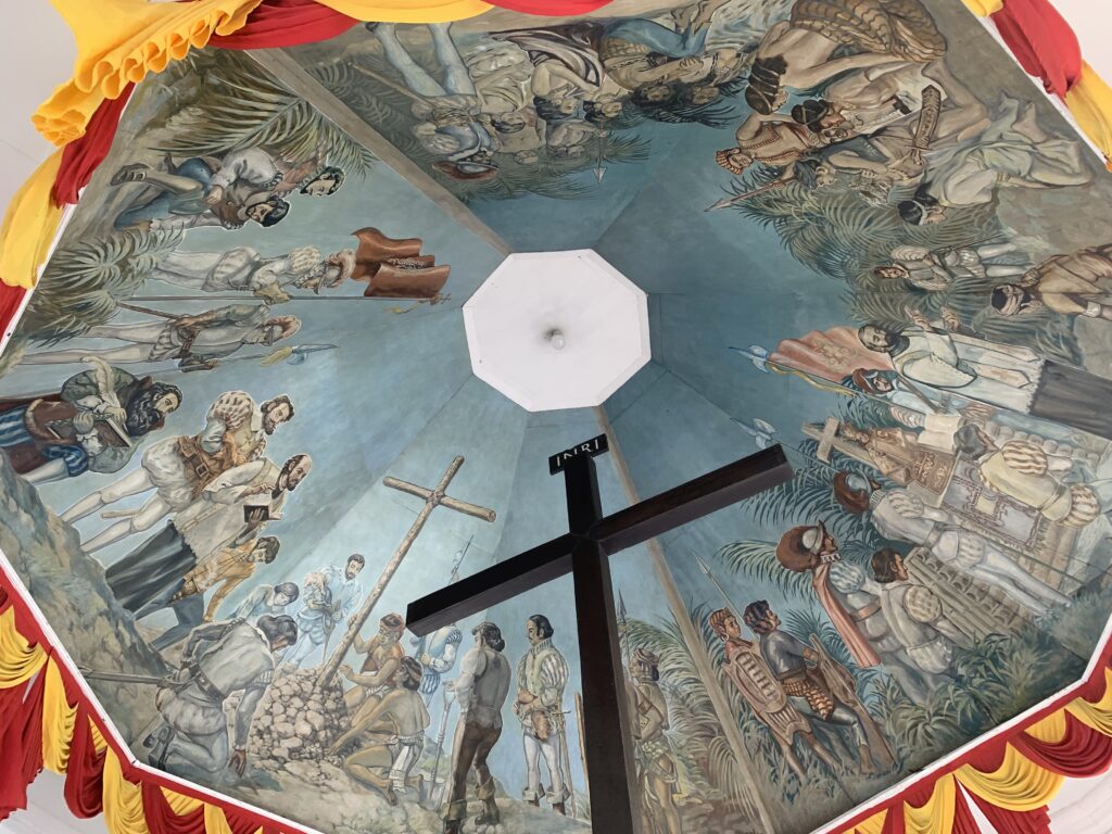 天井を見上げると、マゼランが住民たちに洗礼を授けている様子が描かれたカラフルなフレスコ画が広がっており、歴史の一場面をそのまま見ているような感覚になります。