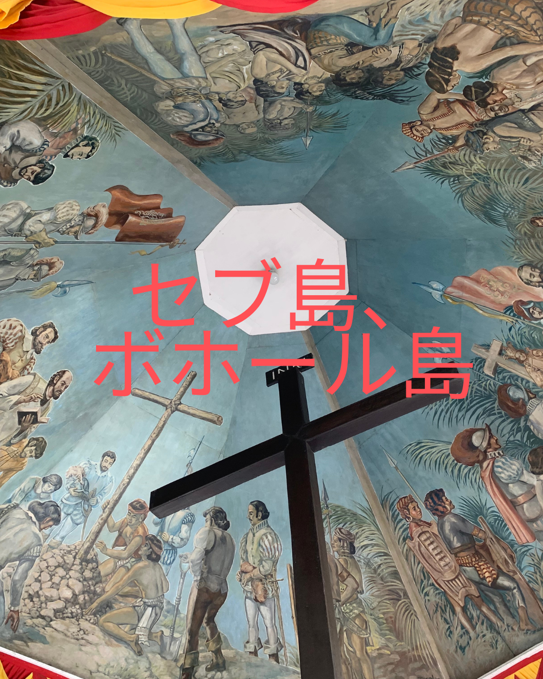 天井を見上げると、マゼランが住民たちに洗礼を授けている様子が描かれたカラフルなフレスコ画が広がっており、歴史の一場面をそのまま見ているような感覚になります。