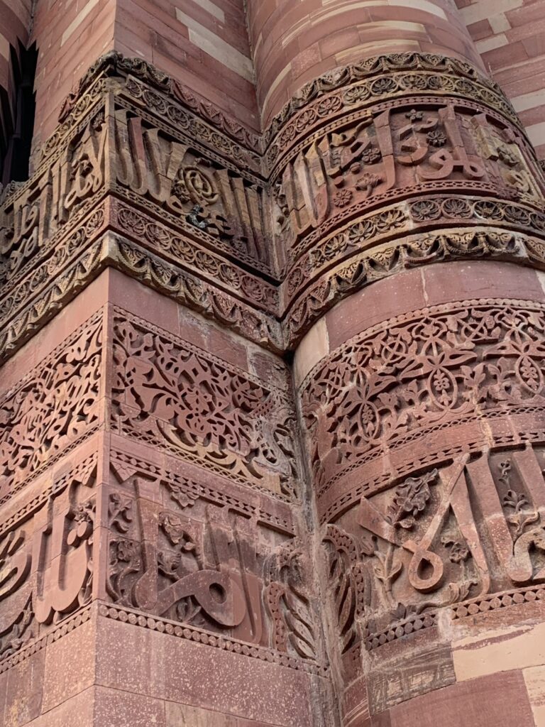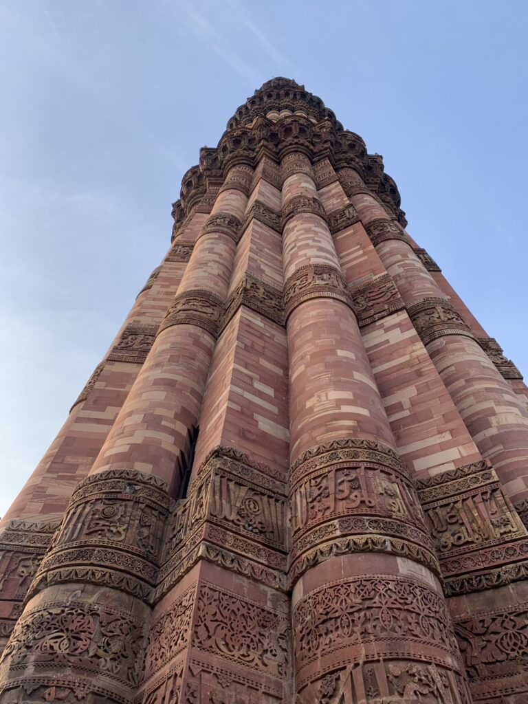 塔の表面には細かい彫刻や美しい模様が刻まれており、近くで見ると職人の技術の高さに驚かされました。赤い砂岩と白い大理石の色の違いも印象的で、角度によって表情が変わるため、写真を撮る手が止まりませんでした。
