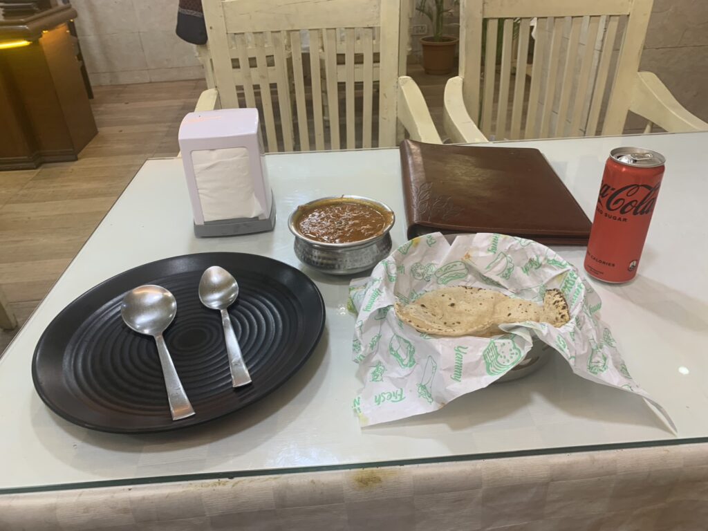 ホテル近くのレストランでチャパティとカレーを食べました。
